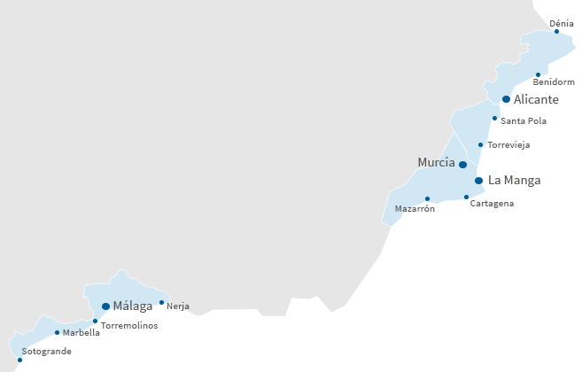 Medland specialises in the sale of new-build homes in the southeast of Spain. Our offer is mainly located on the Costa Blanca (North and South) and the Murcia Coast, also known as Costa Cálida and Costa del Sol. P>