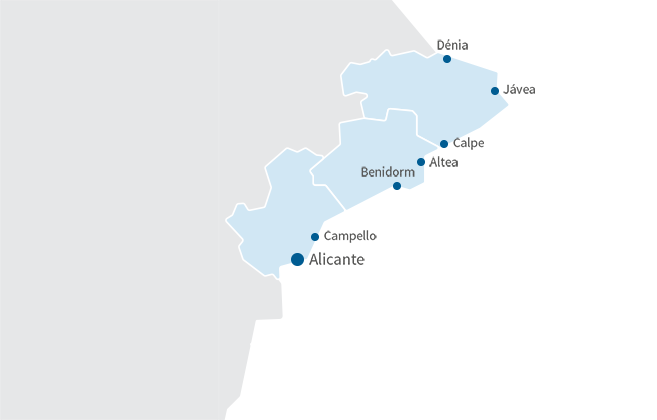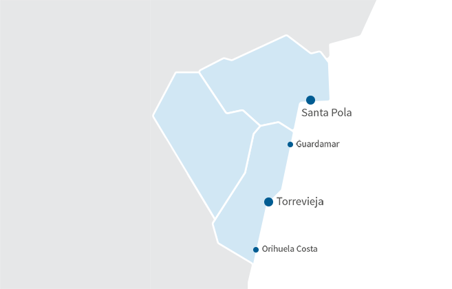 From Denia to Mazarrón, passing through locations as popular as Benidorm, Altea, Guardamar, Cuidad Quesada, Torrevieja, Orihuela Costa, Los Alcázares and La Manga del Mar Menor, Málaga, Fuengirola, Estepona, Marbella and Sotogrande. Either with sea views, on the front line of the golf course, close to services, in all the locations we offer properties that meet the buyer's needs. P>